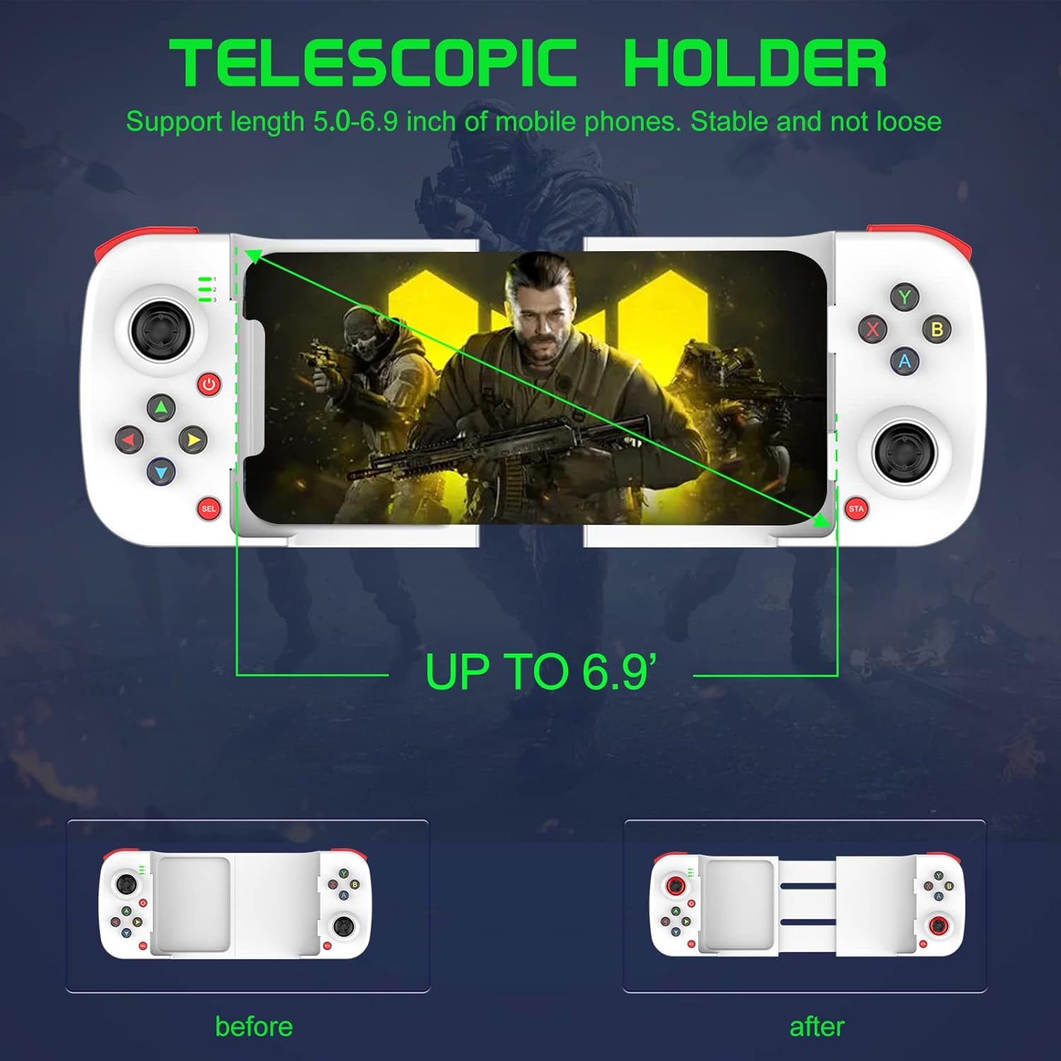 🎮LONG BATTERY LIFE – The bluetooth controller for iphone android comes with 400mAh large capacity rechargeable battery enables you playing the games more than 18 hours after full charge. The holder for device can be stretched, support phones or tablets with 5 -11 inch screens.