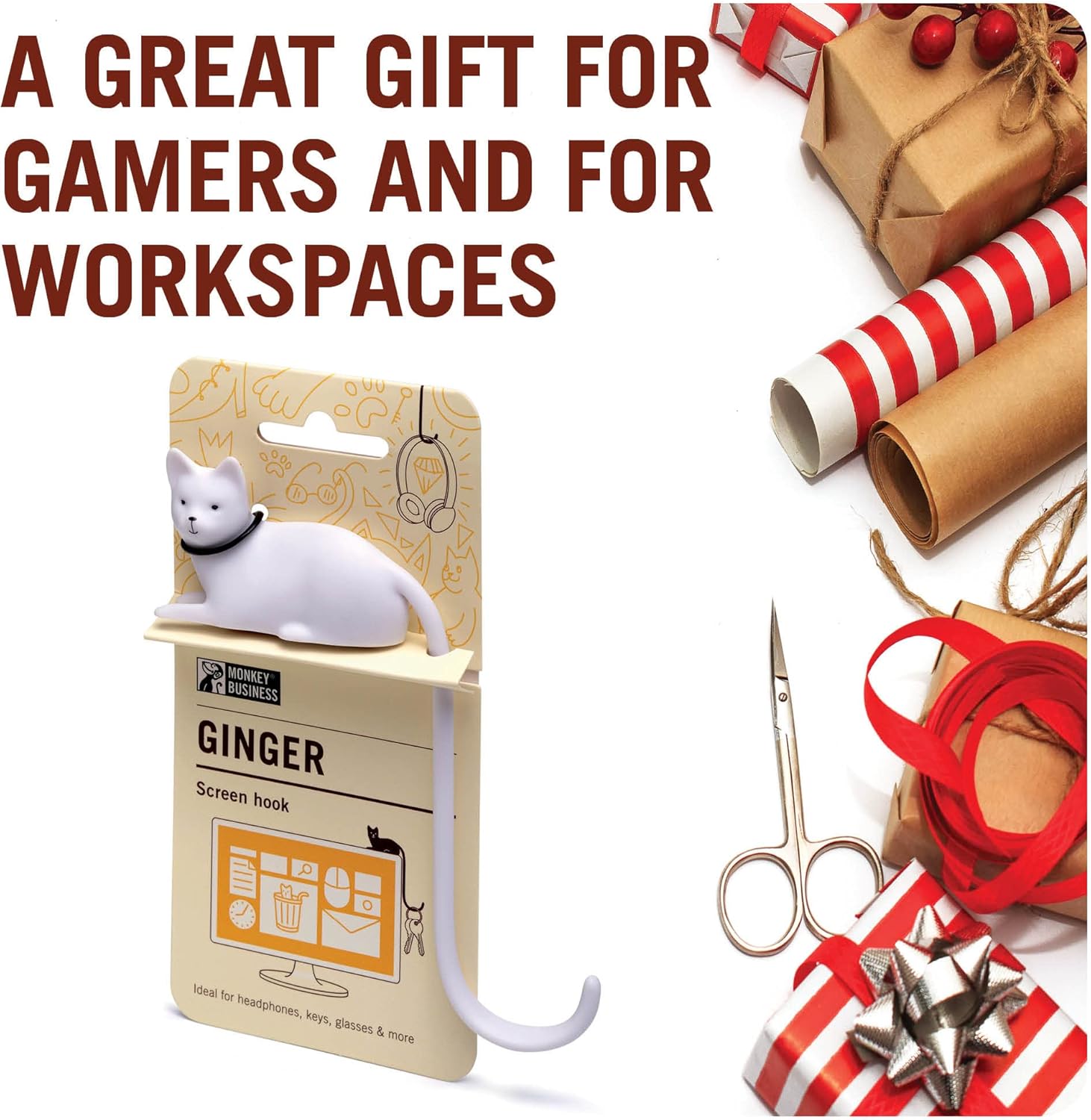 Monkey Business Ginger The Cat Tail Hook for Computer Screen, Desk Headphone Hanger Organizer Decorative Hooks, for Computer Accessories (White)