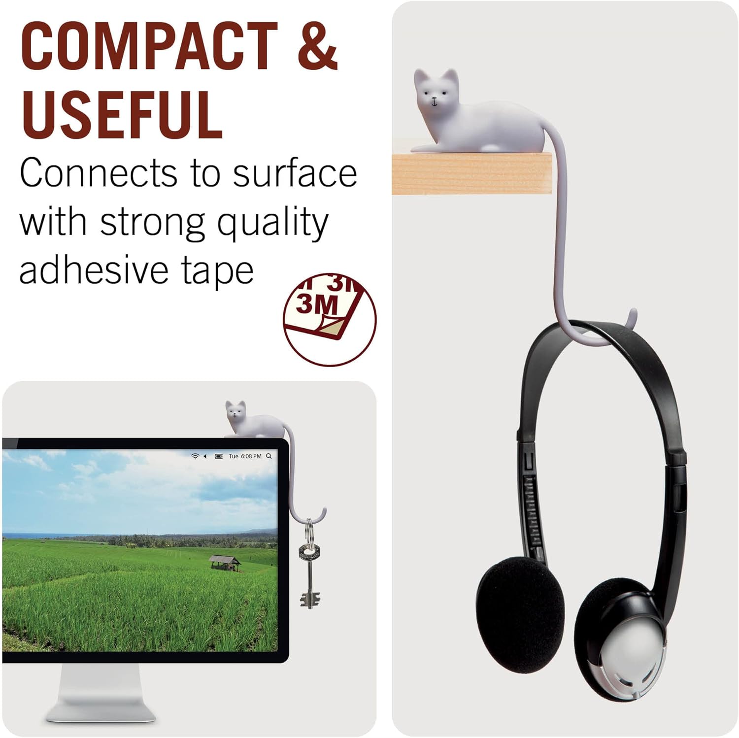 Secure & Stylish: The cat tail hanging hook uses 3M tape for firm placement. Ginger headphone hanger removes cleanly, leaving no residue, ensuring accessories stay safely in place.