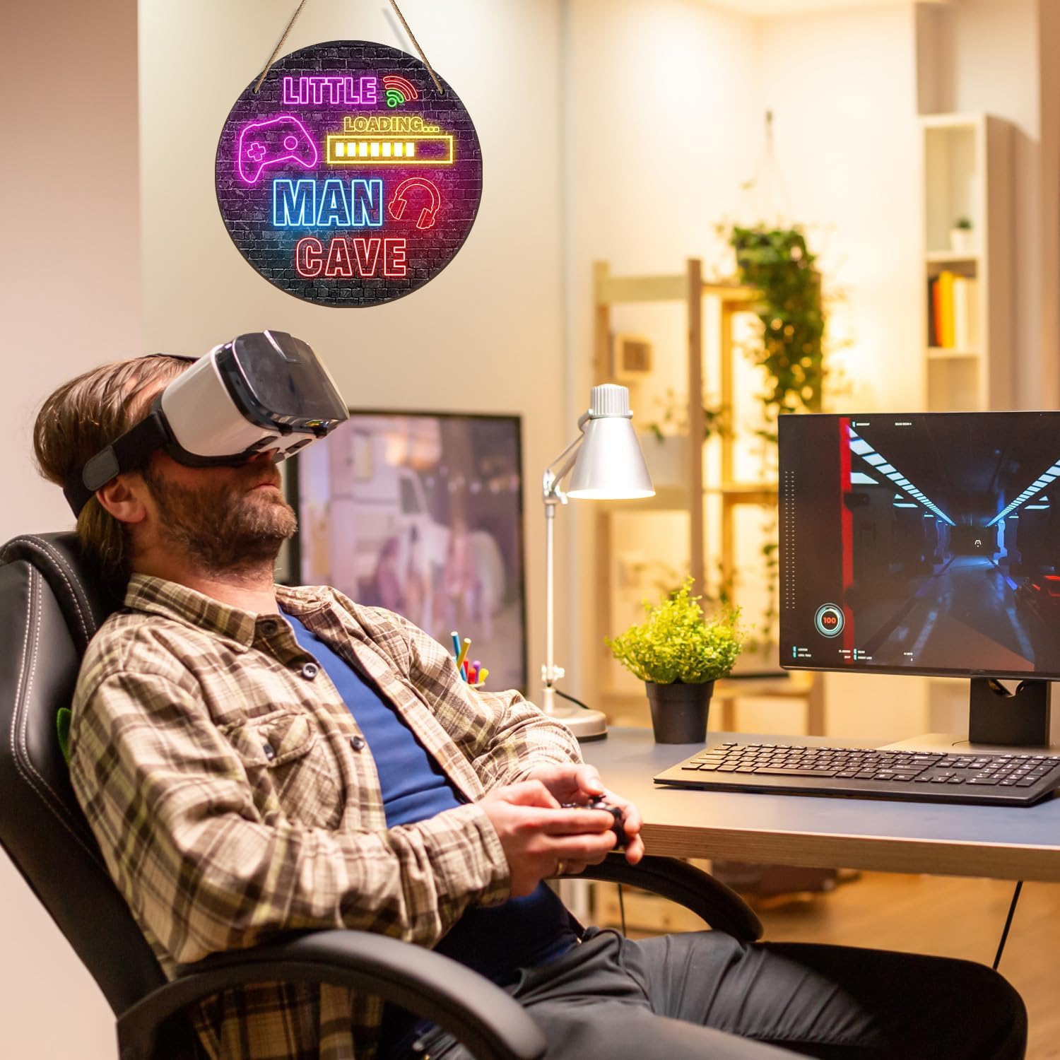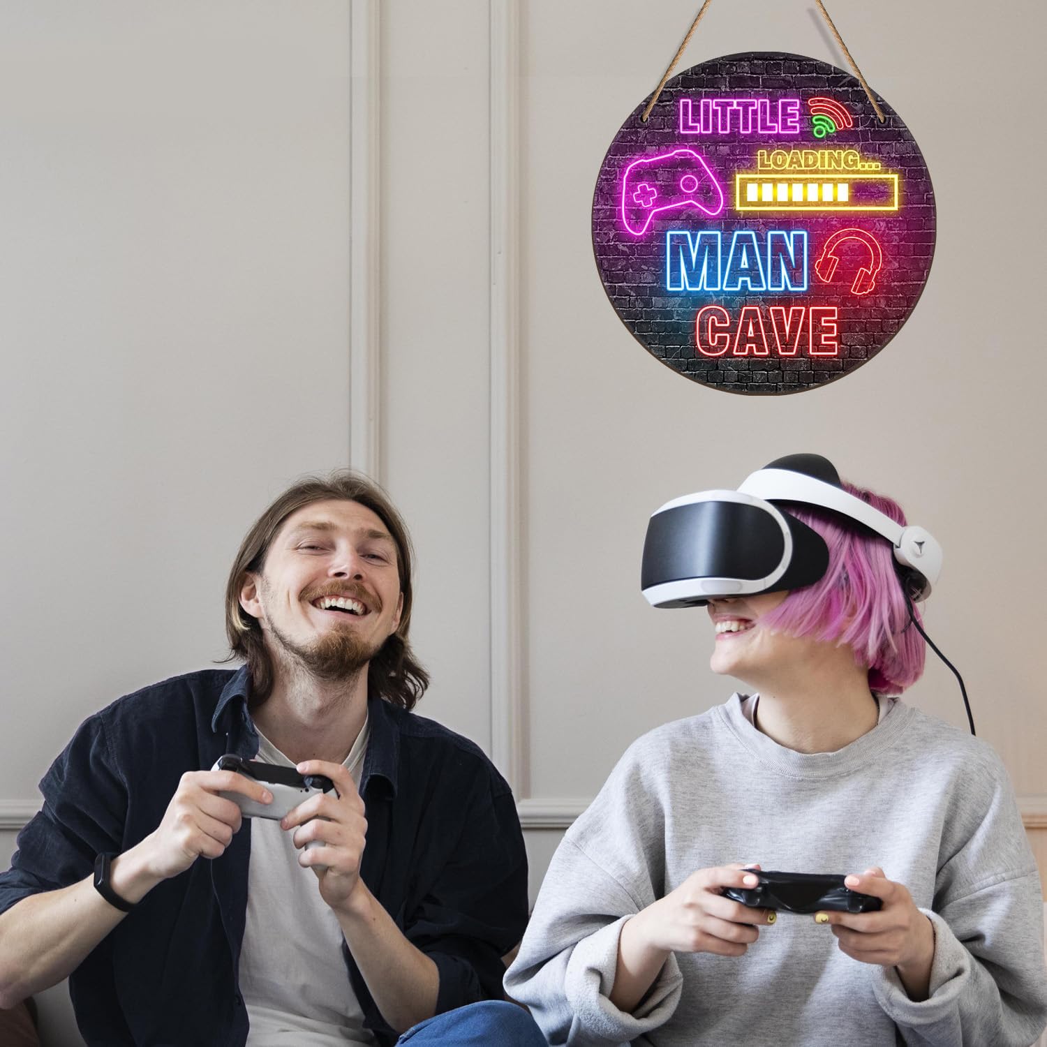 『DESIGN』Our little man cave wooden sign decoration features various neon patterns, such as headphones, game consoles decorates the room well