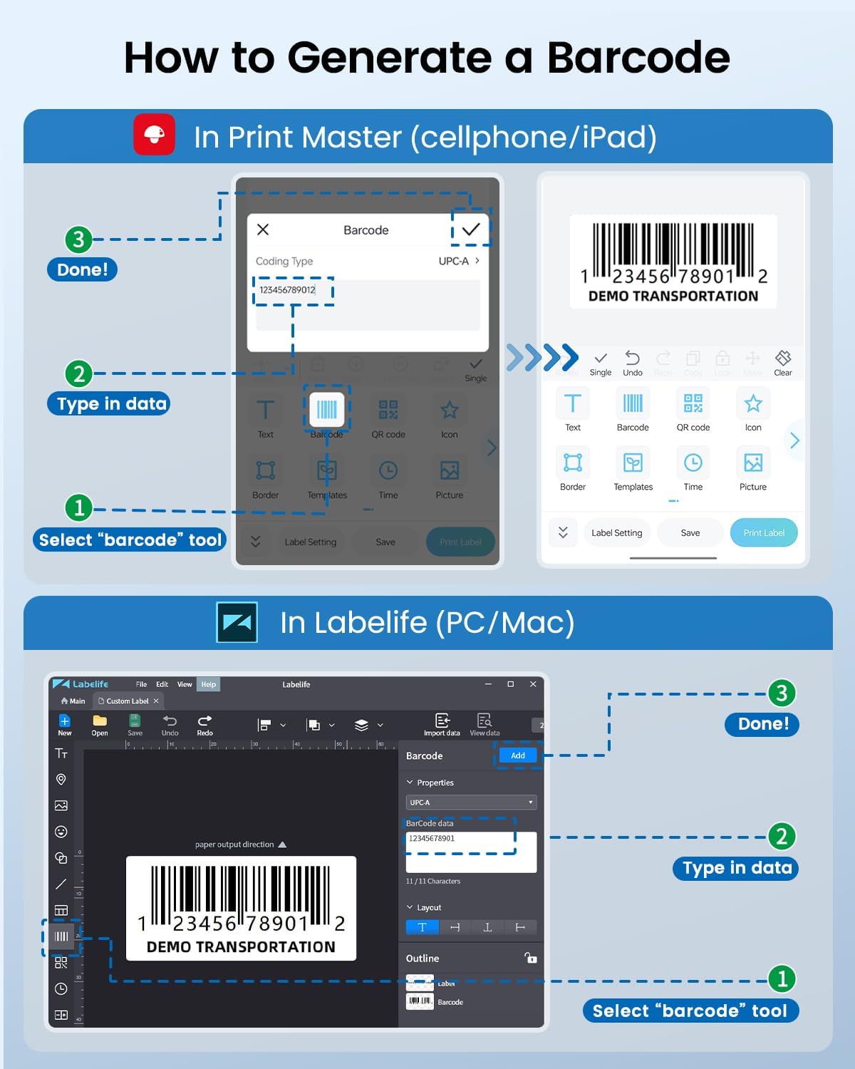 【Capable to Print Anyathing on Labels】This portable label maker can print labels in WIDTH of ¾” to 1⅞” (20mm-50mm), maximum LENGTH of 3⅛”(80mm): text, picture, QR code, barcode label, product label, address label, ingredient label, price label, clothing label, jewelry label, etc.Phomemo Label Printer supports batch printing.
