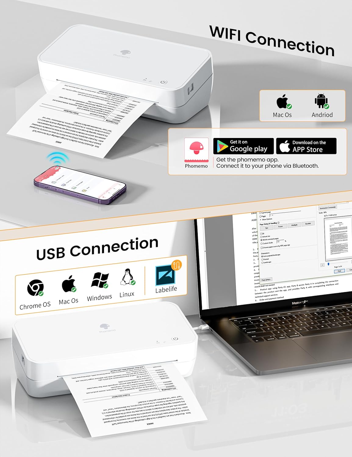 【Supports Multiple Systems】Phomemo S821 WIFI Compact Printer supports smartphone connectivity via WiFi and computer connectivity via USB cable. It is compatible with iOS and Android systems on smartphones and Windows, Mac OS, Chrome OS, and Linux systems on computers. For Chrome OS users, you need to search for “Labelife” in the Chrome Web Store and add the extension to your Google Chrome browser. (For computer printing, you need to download the driver from S821.Phomemo.com).