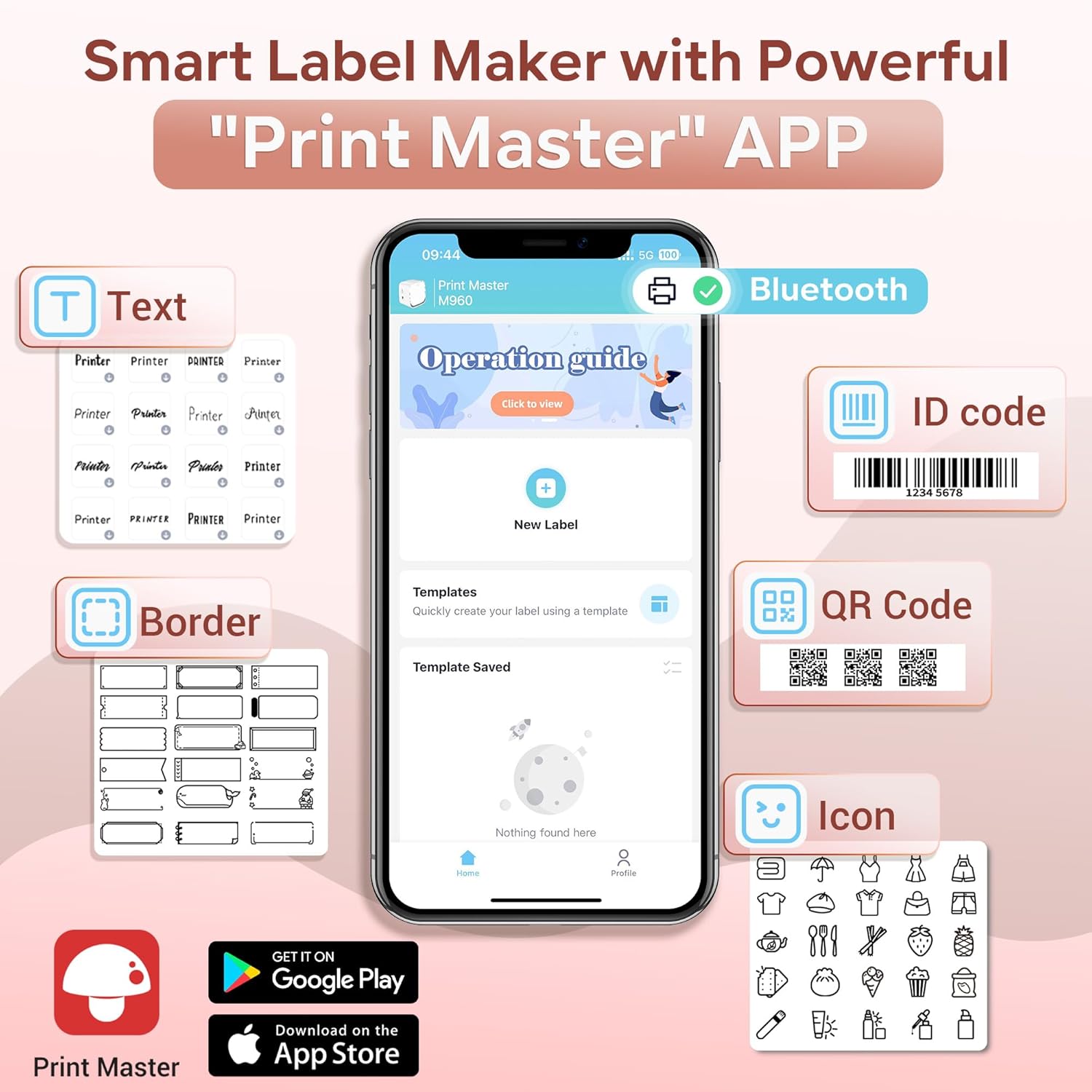Pink Label Maker Machine with Tape-M960 Portable Mini Smartphone Label Makers, Rechargeable Bluetooth Handheld Label Printer Multiple Templates Icon Font for Home School Kids Office Organization