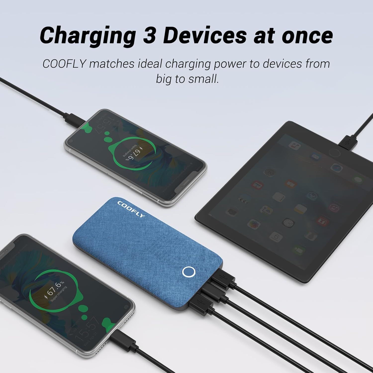 【Dual Output & Input】The battery pack charger portable has a USB-C IN&OUT port and 2 USB-A output ports.COOFLY P176D can charge all devices with your USB-C cables directly.3A fast charging fuels iPhone up to 78% in just one hour.Three ports allow simultaneous charging three devices.