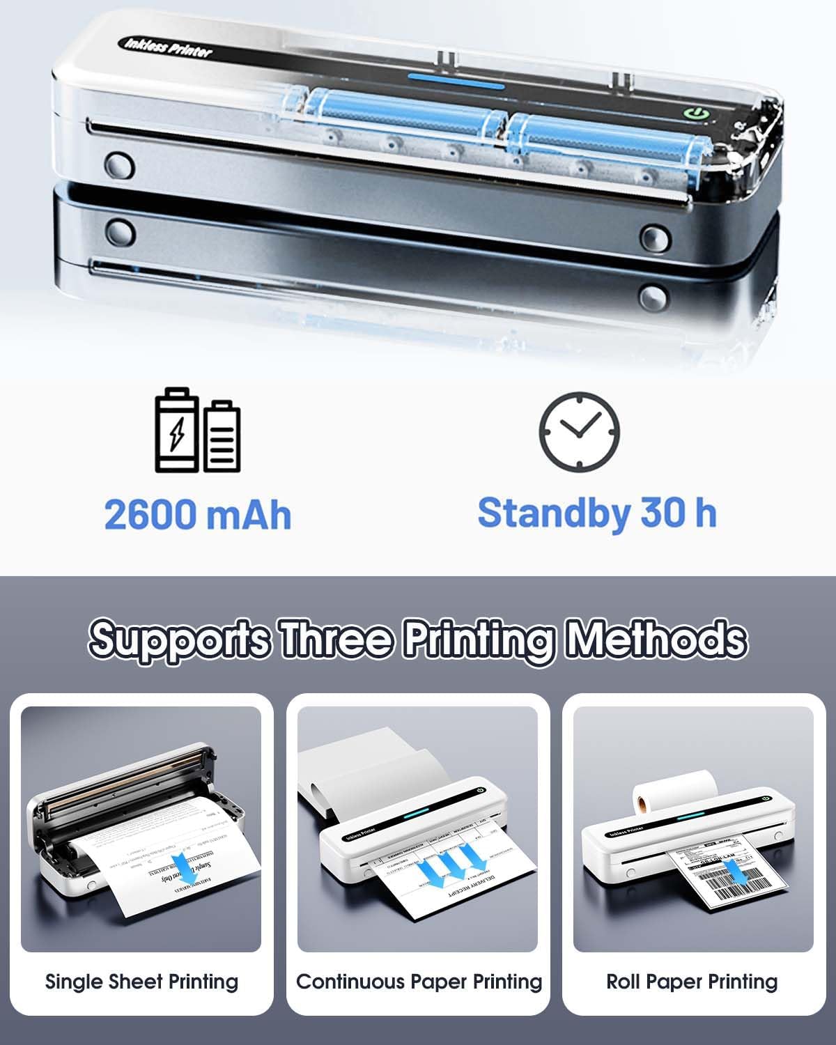 Portable Printers Wireless for Travel: This U.S. letter portable printer measures 10..3×3.07×1.77 inches and weighs 1.52 lb, which is the size of a shoe and the weight of a bottle of water, it can be put in a backpack or suitcase and taken along with you when you travel, and the 2,600 mAh battery can be on standby for up to 30 hours after a full charge, so you can easily cope with the impromptu work when you are traveling.