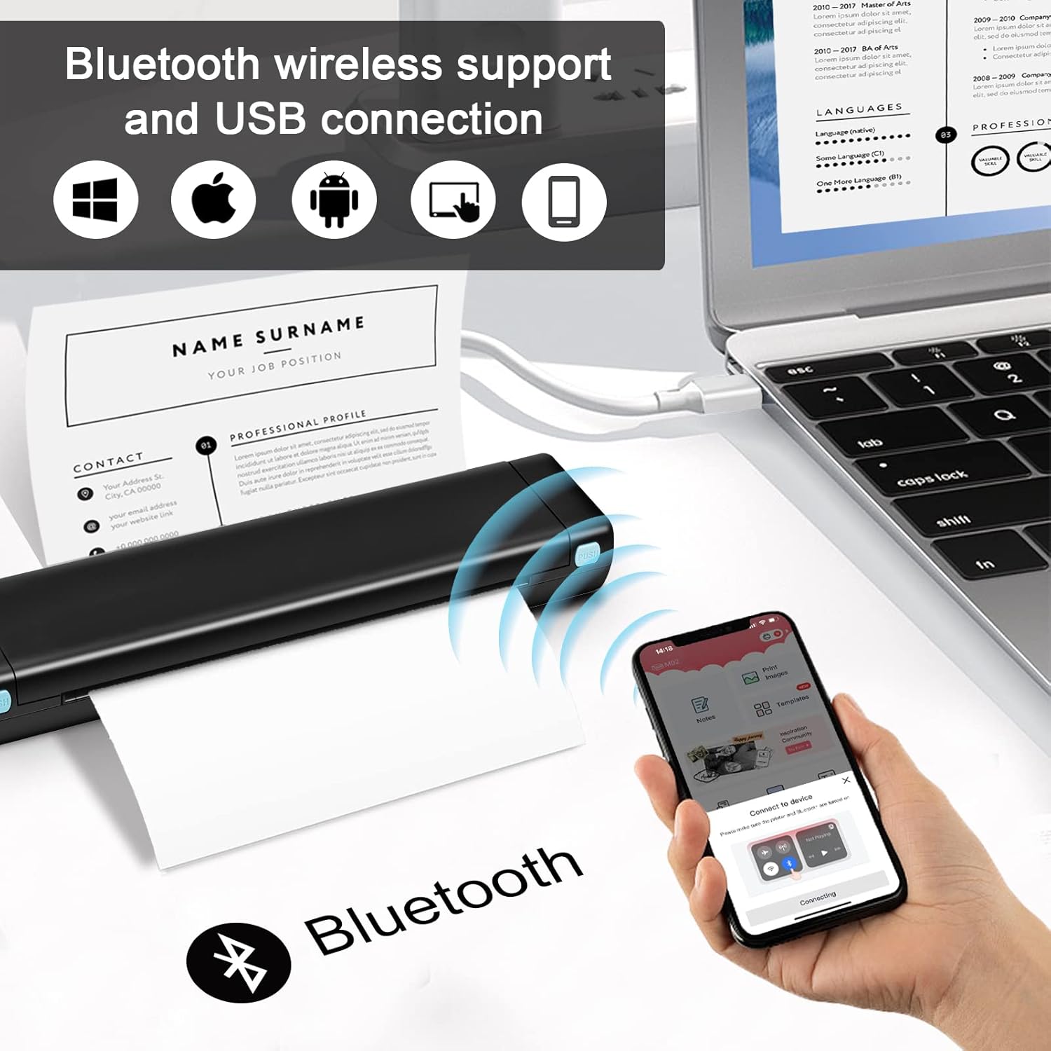 Wireless bluetooth printer: Our travel printer supports bluetooth connection, you can connect bluetooth through your mobile phone and print anytime and anywhere. It also supports USB connection. (MacOS, Windows, Chrome)