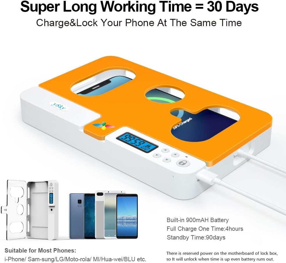 【30 days long working Time with Auto-Timer】: Max working Time Reach Up 30Days Once Full Charge. Max setting Time is 99hrs and 59mins ,Super standby time over 90 days.Phone jail box with timer can make you reduce screen time, focus on work, study and life, effectively multiply your time.