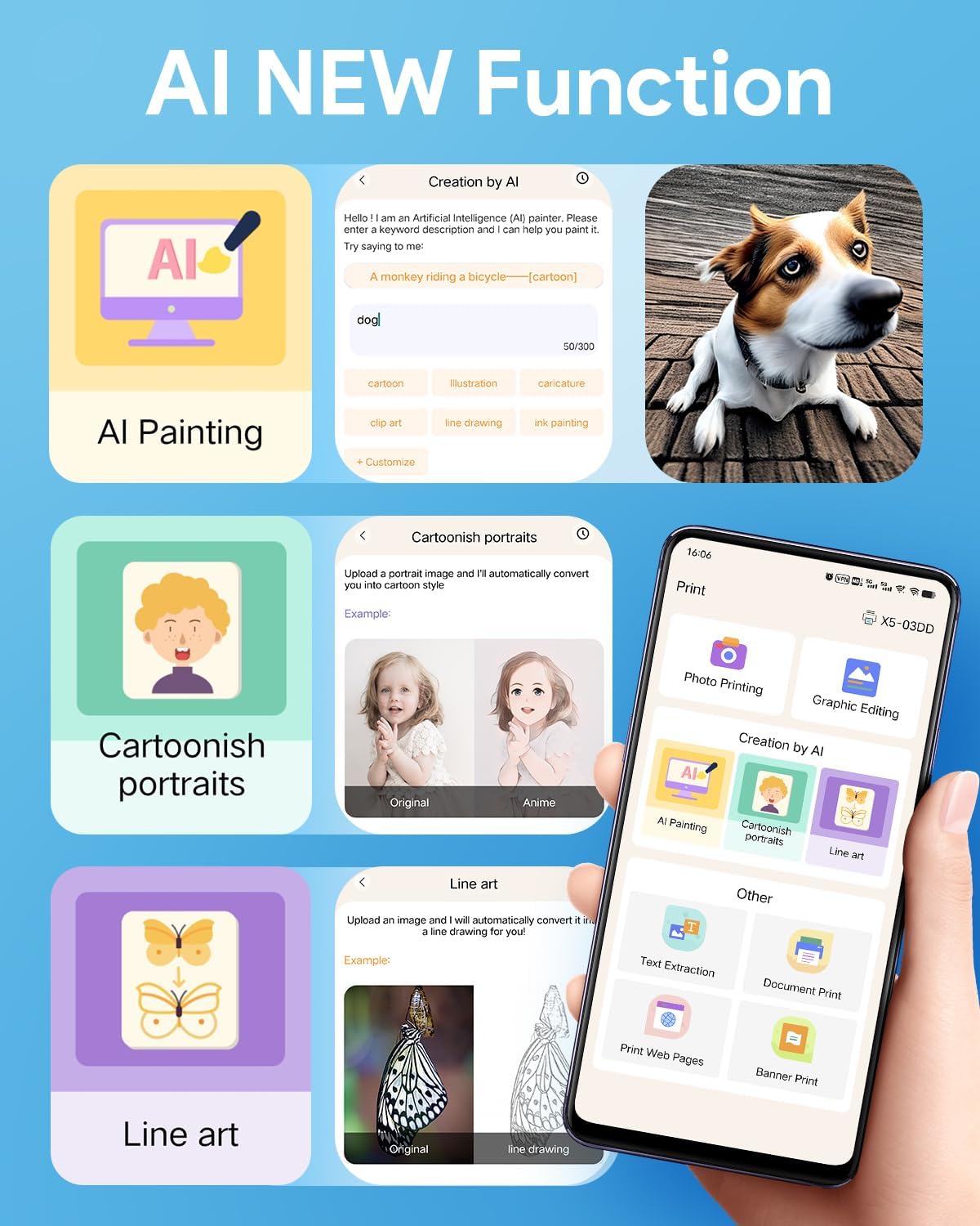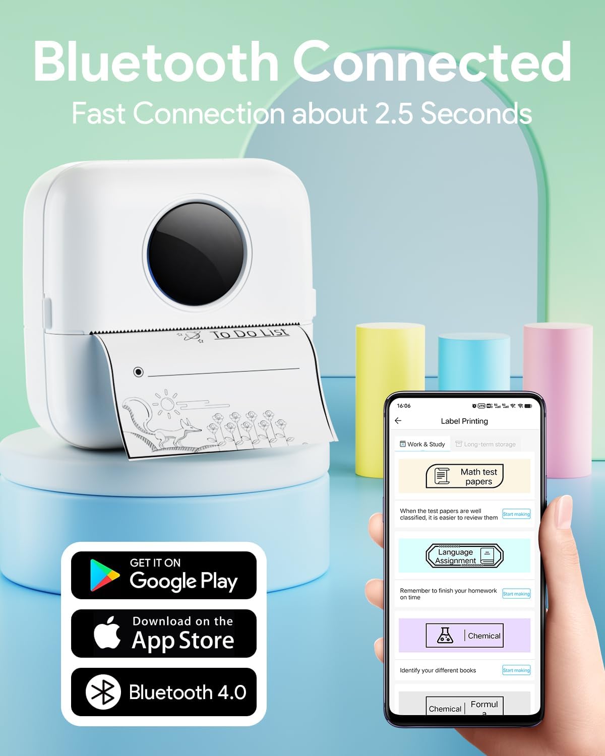 ✨ COMPACT PORTABLE & MULTIFUNCTIONAL – Effortlessly connect via BT 4.0, pairing with your phone in seconds. Weighing just 6.5 oz, this photo printer fits in your pocket. This versatile Label Maker goes beyond print storage labels for organization, decorate greeting cards creatively, or print phone records for enhanced study and office productivity