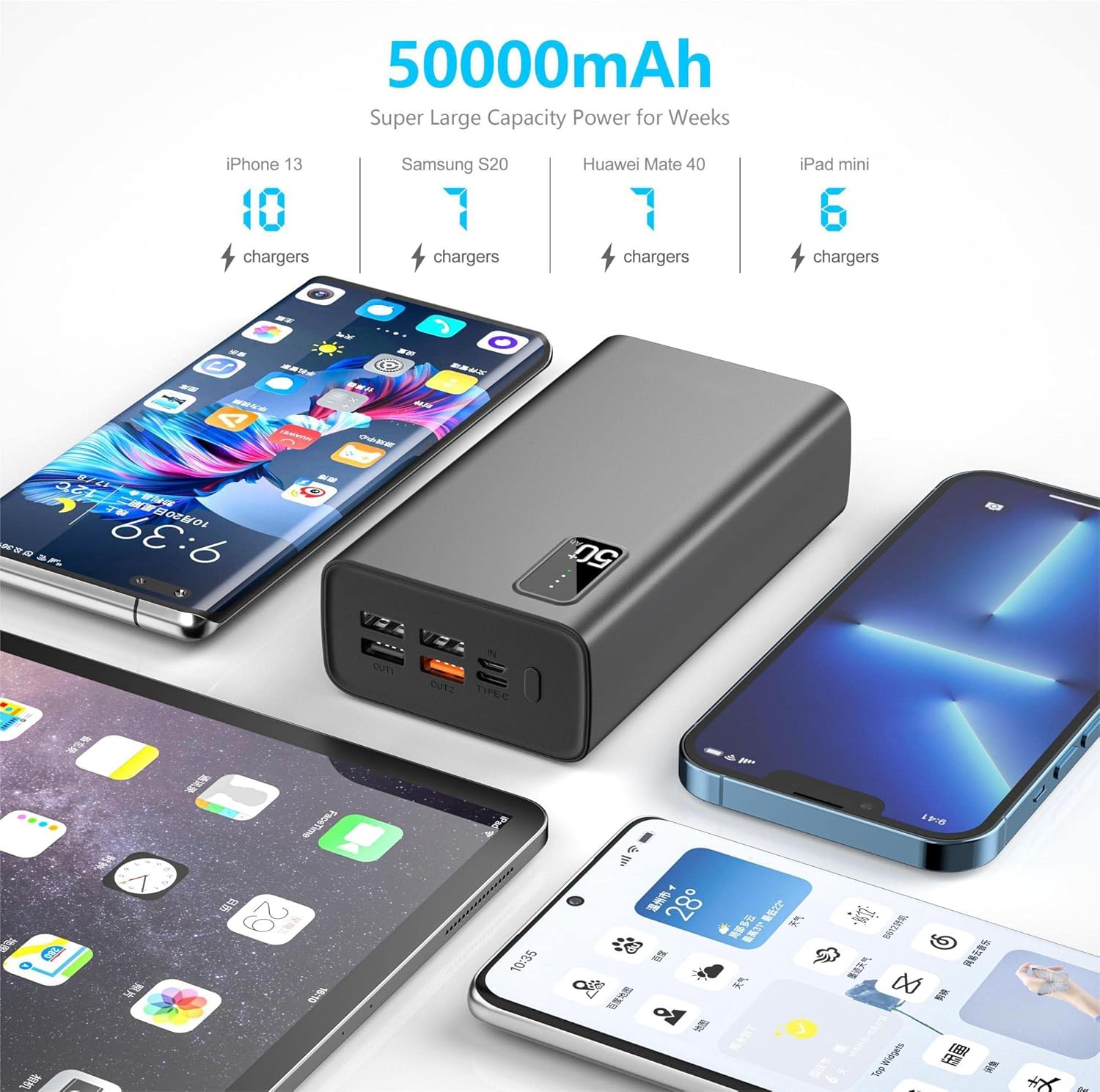 ใ50000mAh Super Large Capacityใ Equipped with 50000mAh lithium-polymer battery, provides sufficient power for digital devices, supplies 10 charges for iPhone 12, iPhone 13, 7 charges for Samsung Galaxy S21 Ultra.