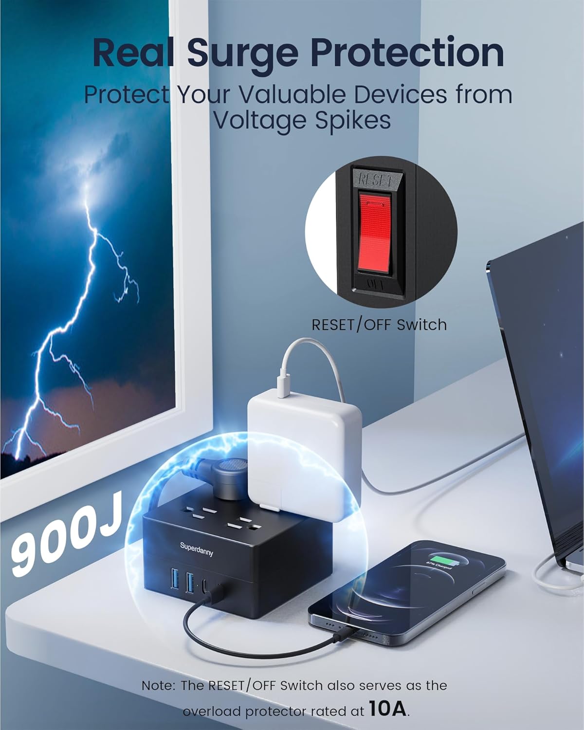 ▶【All-Round Protection Technology】With a built-in 900J surge protector, our electrical multi-outlets will filter the minor surges in the circuit and shut off when an overwhelming surge occurs, like that caused by lightning. And the shell is made of Flame Retardant Material which is able to withstand temperatures high up to 1,380℉ (750℃). Besides, this universal power socket also has over-load/ short-circuit/ USB over-voltage/ USB over-current/USB over-heated protection.