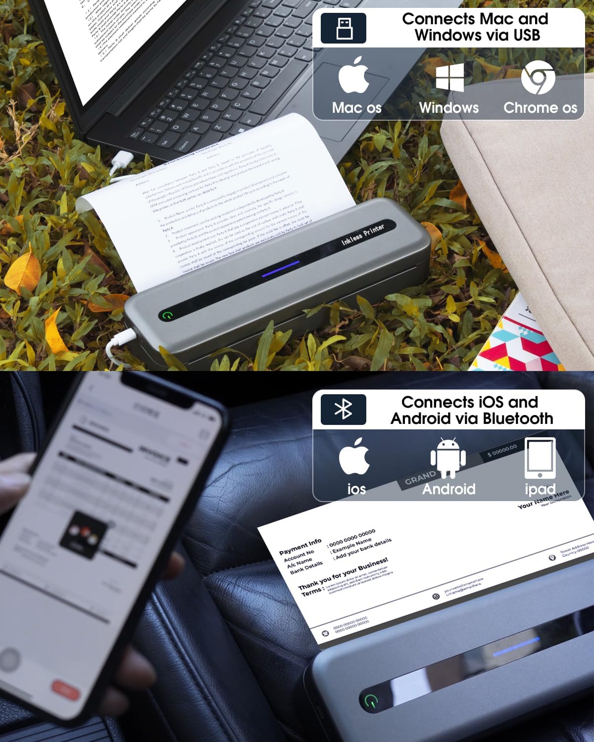 Printer Portable Wireless Bluetooth for 2/3/4/8.26×11.69/8.5×11 Inch Thermal Paper – A4 Inkless Mobile Printer for Home Travel Office Vehicles iOS Android Mac Windows Chrome PDF TxT Word 300DPI 1.5Lb