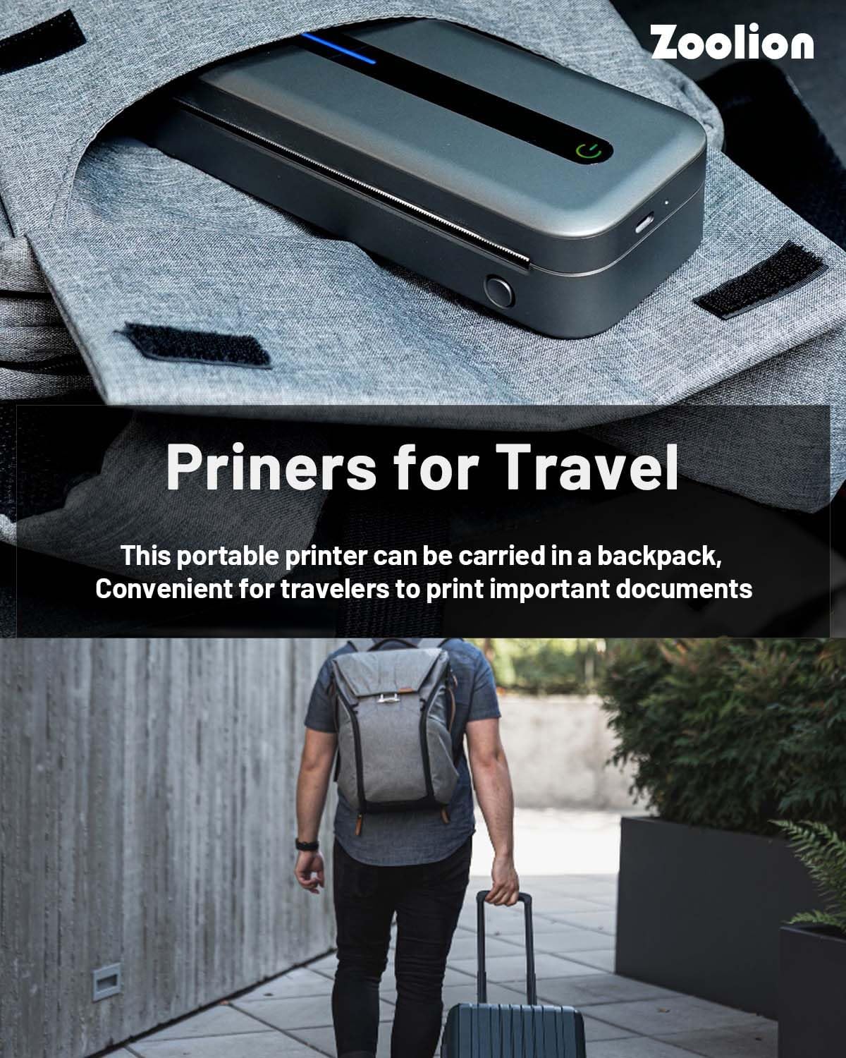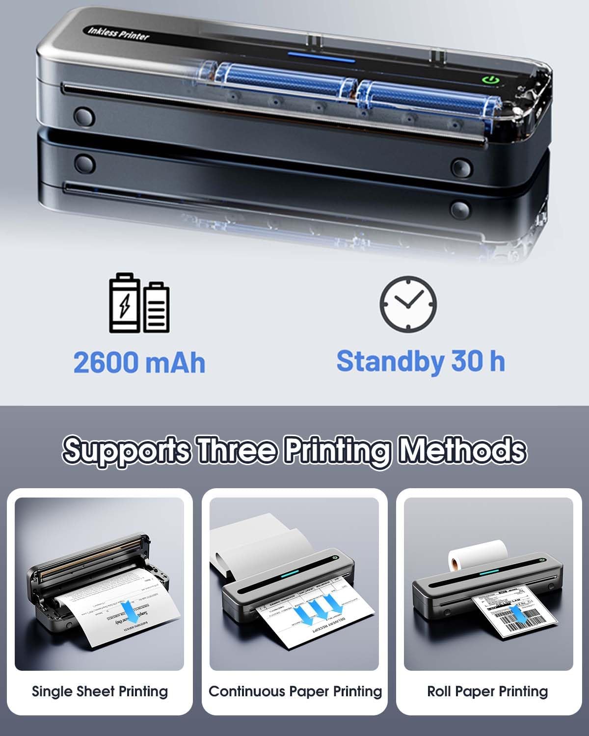 Portable Printers Wireless for Travel: This A4 portable printer measures 10..3×3.07×1.77 inches and weighs 1.52 lb, which is the size of a shoe and the weight of a bottle of water, it can be put in a backpack or suitcase and taken along with you when you travel, and the 2,600 mAh battery can be on standby for up to 30 hours after a full charge, so you can easily cope with the impromptu work when you are traveling.