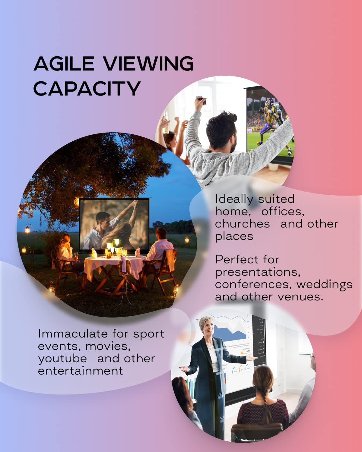 Viewing capacity enables usage in any places: home, school, office, church, classroom, backyard; on any venues: presentations, conferences, weddings, parties; for any entertainments: sport events, movies, TV shows, video gaming, youtube