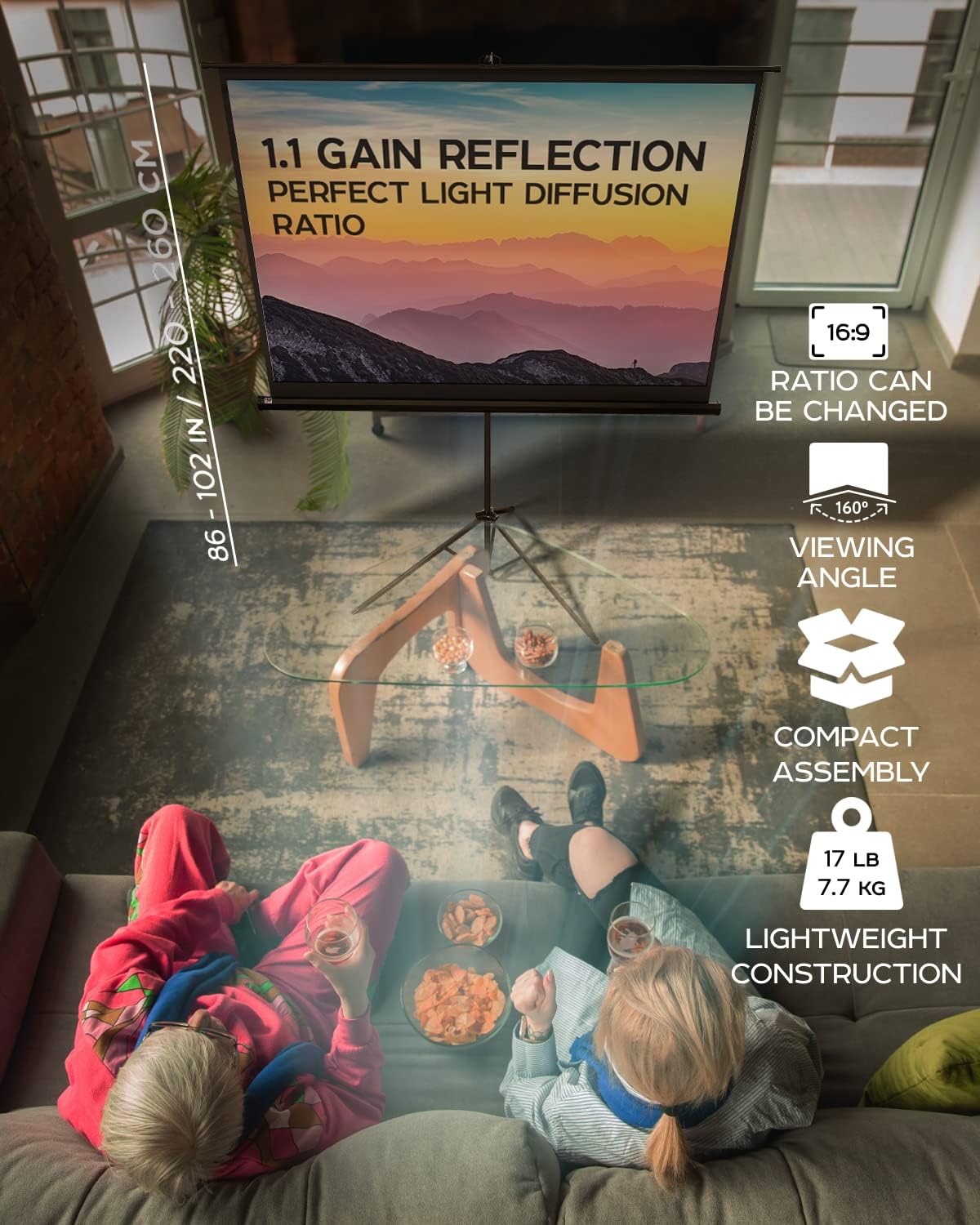 Projector Screen with Stand 100 inch – Indoor and Outdoor Projection Screen for Movie or Office Presentation – Adjustable from 16:9 to 4:3 HD Premium Wrinkle-Free Tripod Screen for Projector