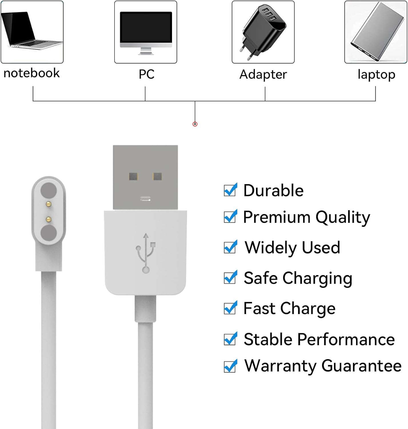 Replacement Charger Compatible with ID208BT – ENOMIR/Aeac/Konitee/FACOI/VRPEFIT/Tensky Charger Cable 1.9ft USB Magnetic Charging Cord for VeryFit ID208BT Smart Watch Charger (White&White)