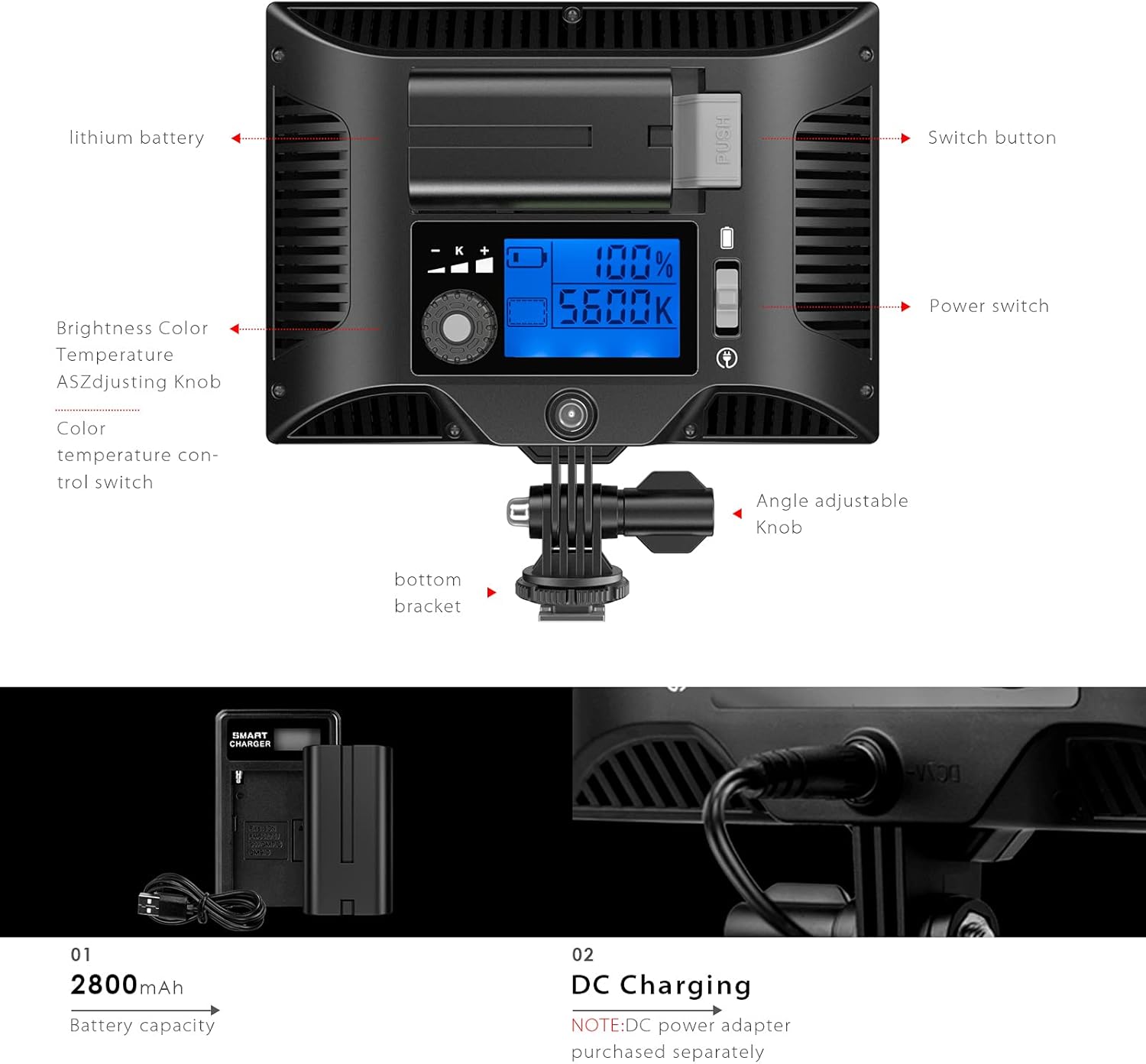 BUILT-IN LCD DISPLAY – The LED light panel with LCD display on back of the light, it show clearly the status of color temperature, brightness, battery power, which convenient to control the current shooting and work effectively.