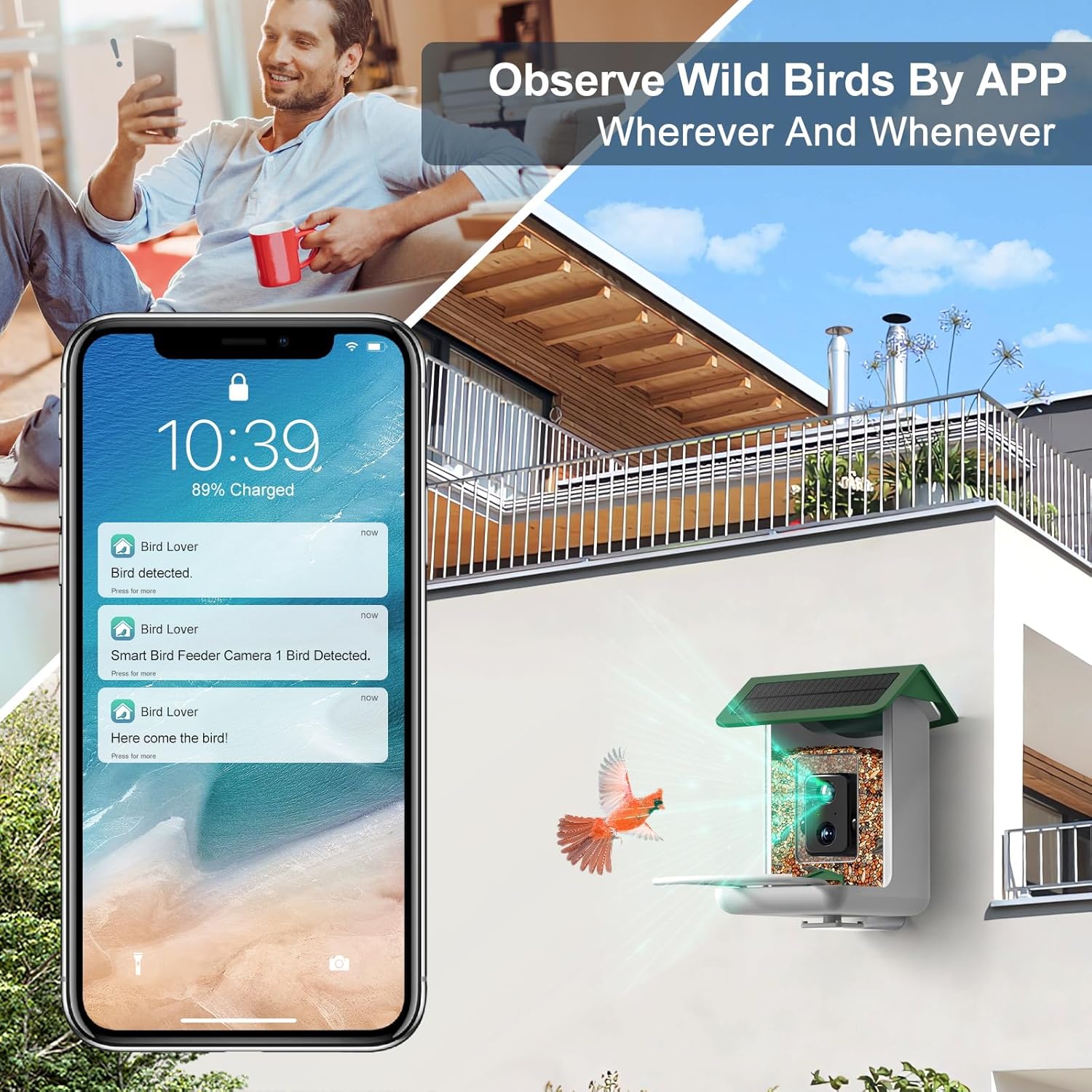 Smart Bird Feeder Camera, Free AI Forever, 32G TF Card & 1080P HD Camera Auto Capture Bird Videos & Solar Panel, App Notify When Birds Detected, Bird House with Built-in Two-Way Microphone