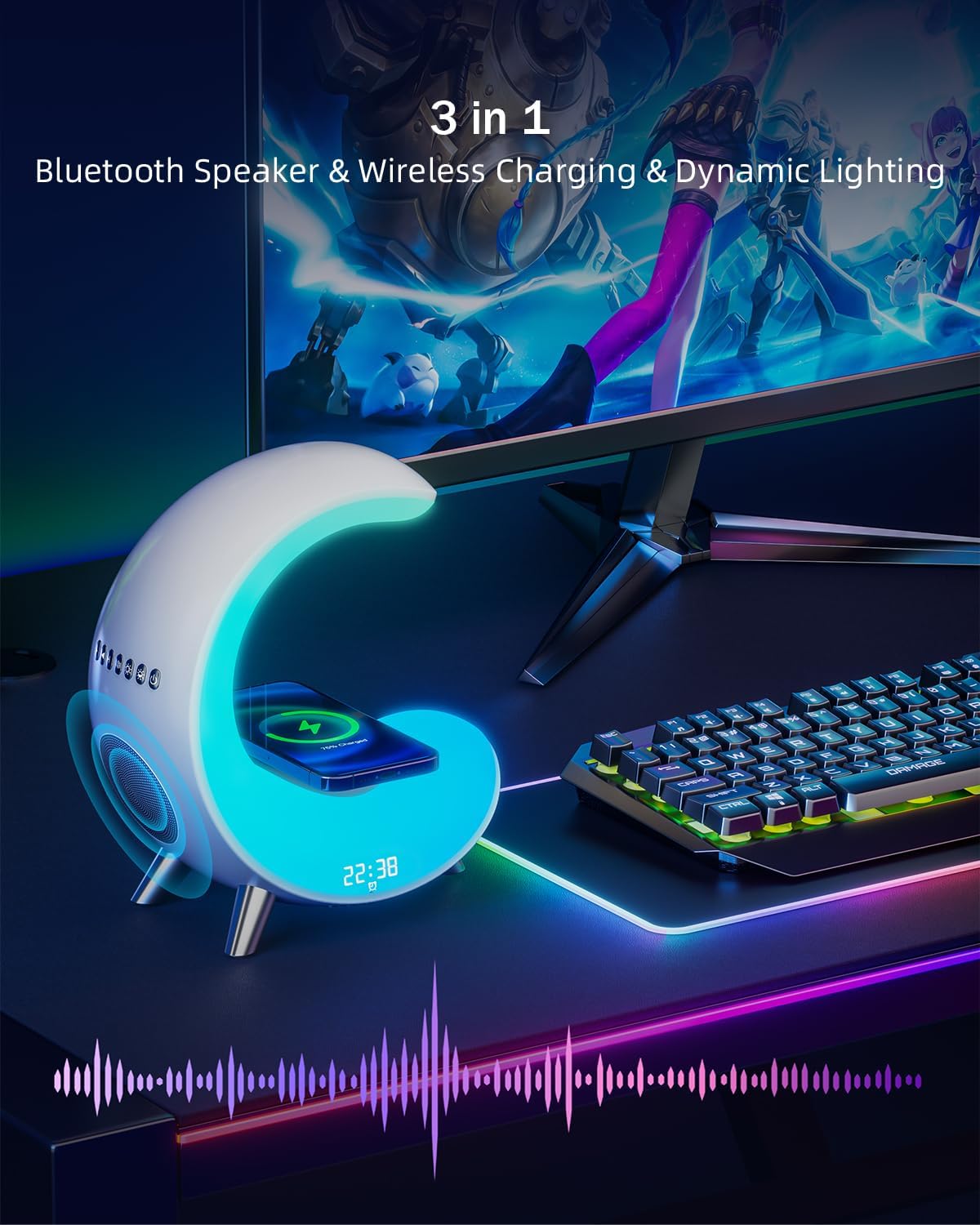 SONTHIN Desk Lamp with Wireless Charger, Table Lamp with Bluetooth Speaker Alarm Clock, Color-Changing Ambient Light for Living Room, Bedroom, and Gifts