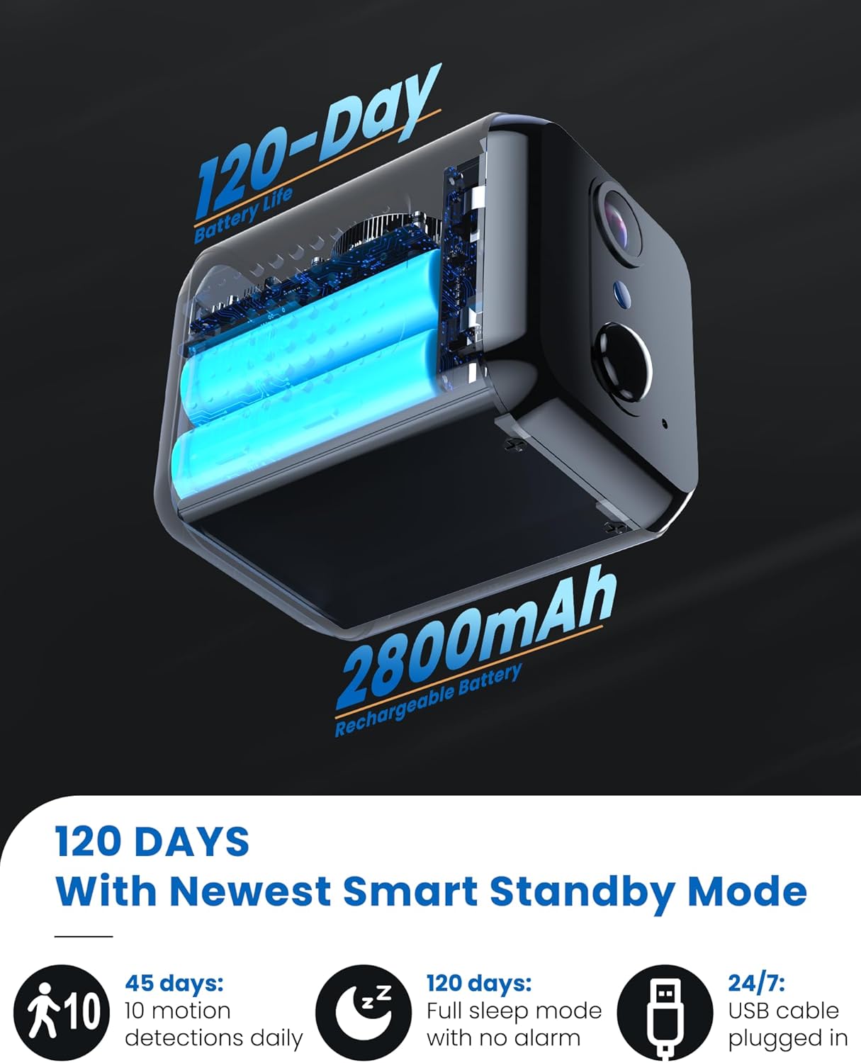 𝐓𝐫𝐮𝐞 𝐖𝐢𝐫𝐞𝐥𝐞𝐬𝐬 𝟏𝟐𝟎-𝐃𝐚𝐲 𝐒𝐭𝐚𝐧𝐝𝐛𝐲 𝐁𝐚𝐭𝐭𝐞𝐫𝐲 𝐋𝐢𝐟𝐞: No more battery anxiety. Our new version nanny camera has a 2800mAh battery and the advanced Standby Mode tech, It will go to Sleep Mode if no motion detected. This hidden camera can work 45 Days with 10 times motion detected daily, or 120 Days with full sleep mode(No motion detected) , also can work 24/7 with a USB cable plugged in.