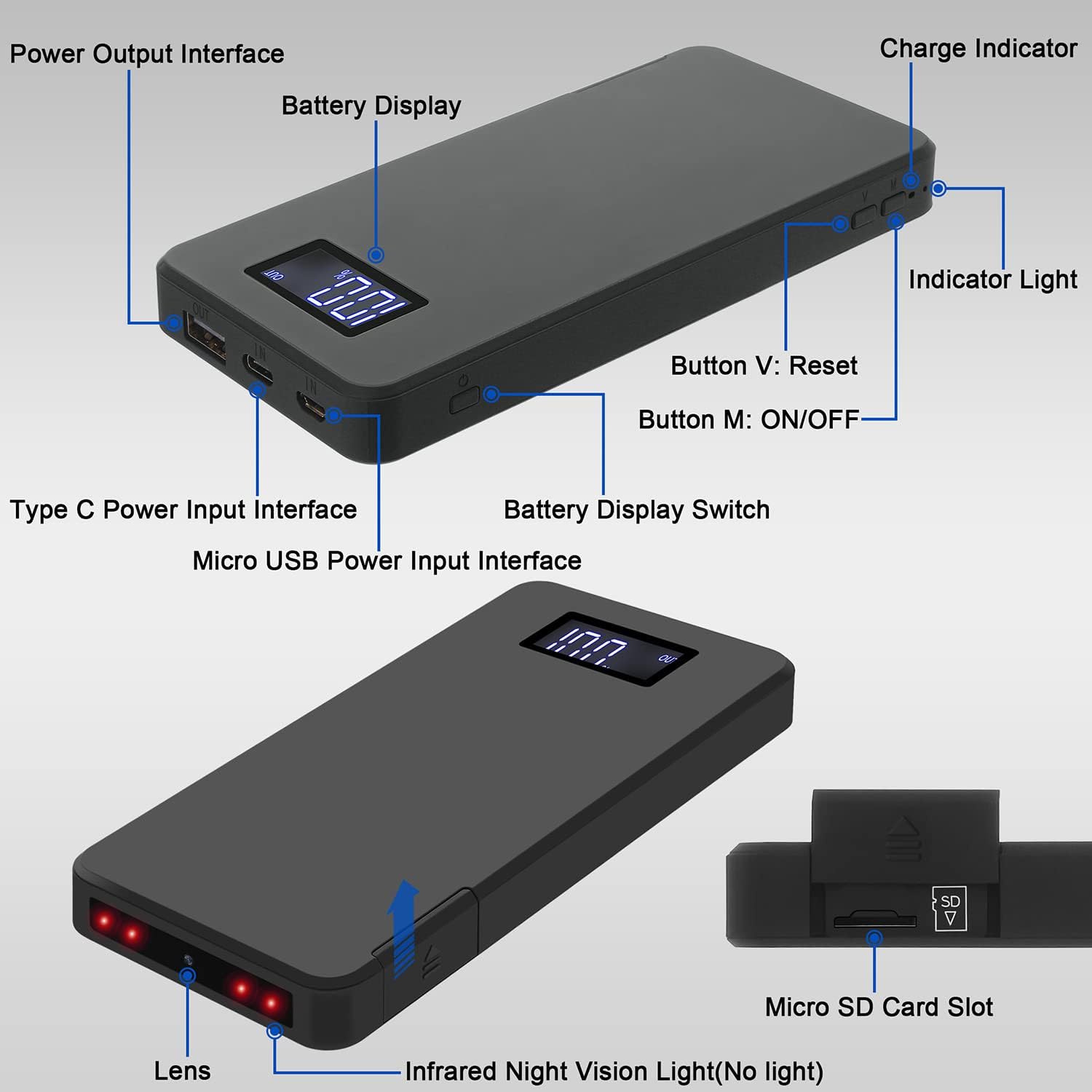【25-hour Long Battery Life Mini Spy Cam】The small hidden camera has a built-in 10000 mAh large capacity battery, it lasts continuously for 20 hours working on a fully charged. A card inserted will take videos automatically and you could store 24/7 surveillance footage on a local card(not included, max up to 256GB) and the spy camera overwrites the oldest files when card full for continuous recording.