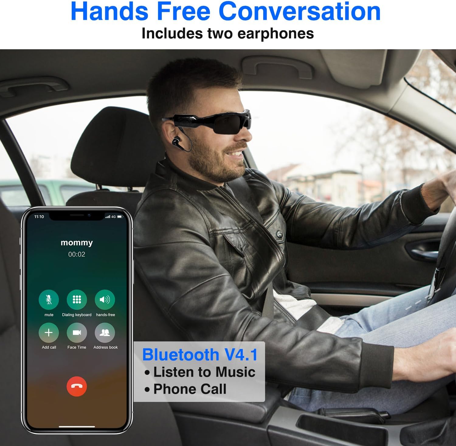 CREATIVE DESIGN: Upgrade version sunglasses looks like ordinary sunglasses, in fact these sunglasses are also a mini motion camera, it supports video and bluetooth function. With a weight of only 50g and plastic frame with rubber legs, making the wearing experience lighter and more comfortable. Excellent gift for family and friends, perfect for driving/riding/fishing/motorcycle and outdoor sports.