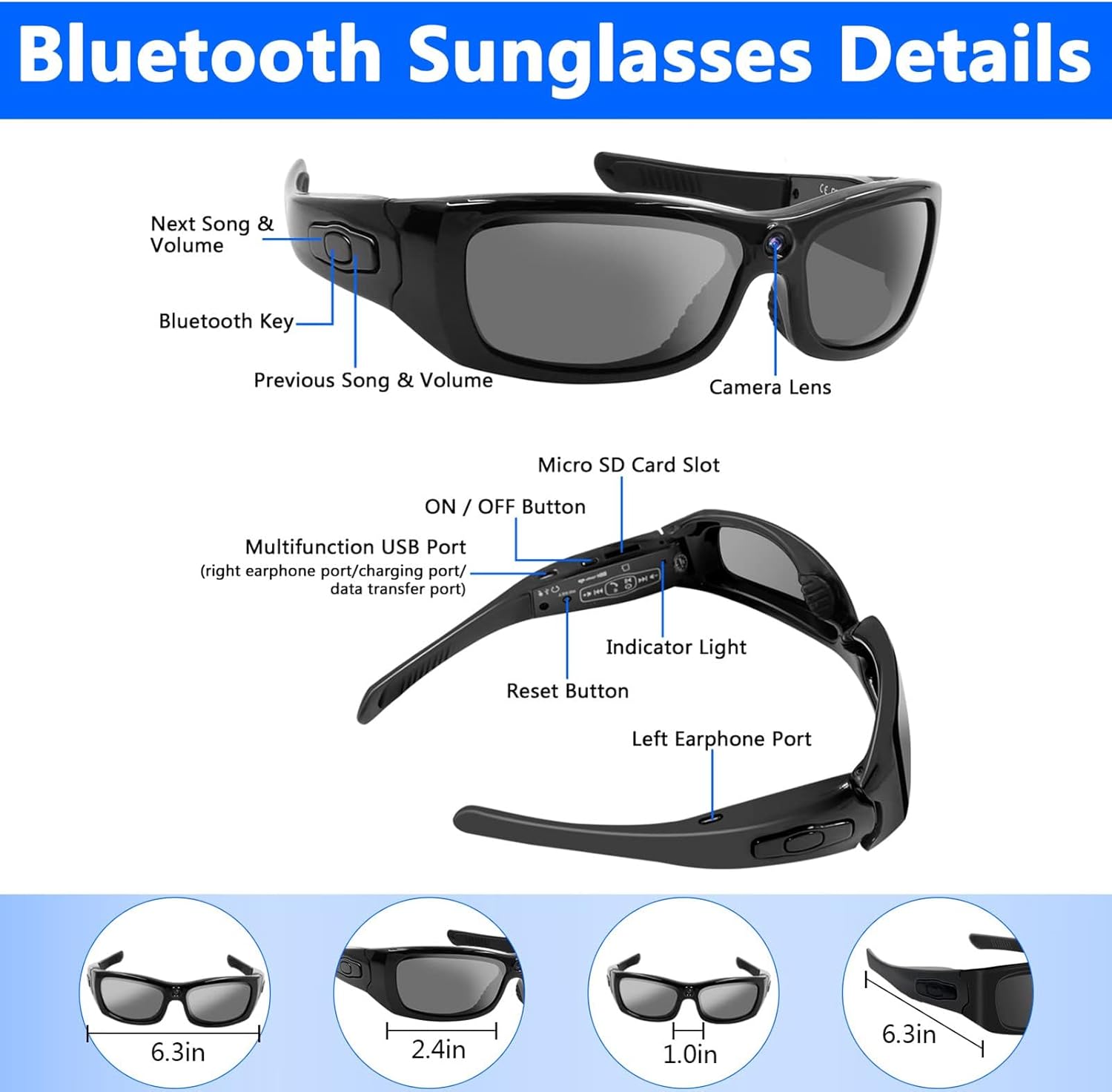 Bluetooth V4.1: Using advanced bluetooth chips, the glasses with camera ensure stable and reliable connectivity up to 33 feet (10 m). So now you can enjoy the rhythm of music or all-round high-quality calls when you are driving. After fully charged, the bluetooth can be on standby for 20 days, lasts approximately 10 hours of talk time.