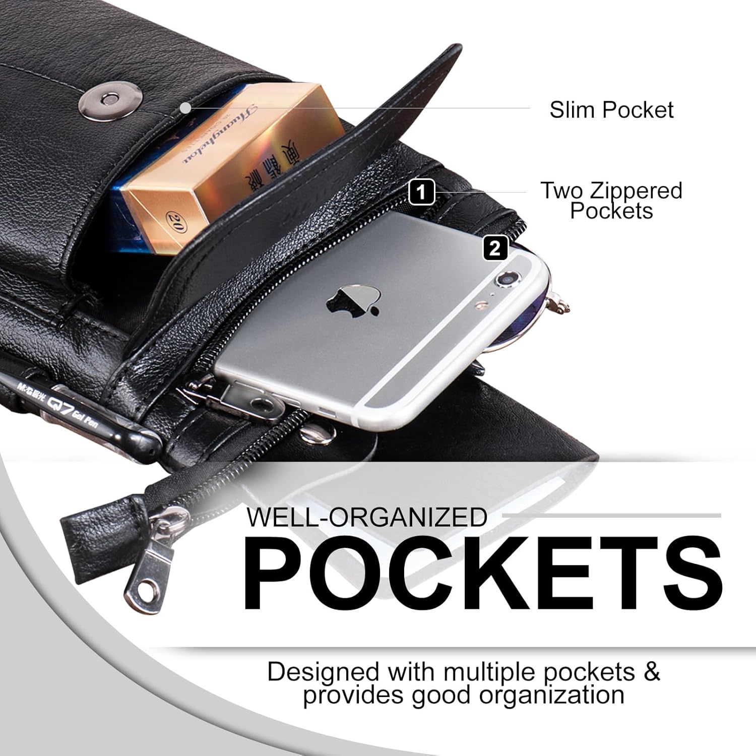SMART POCKET SETUP: Two zip pockets (the Largest Pocket to hold your phone, powerbank, glasses etc.), a front pocket under a leather flap (To carry your cards, keys, earphone or small things), and an external pen holder. Stay organized with thoughtfully designed pockets for all your items.