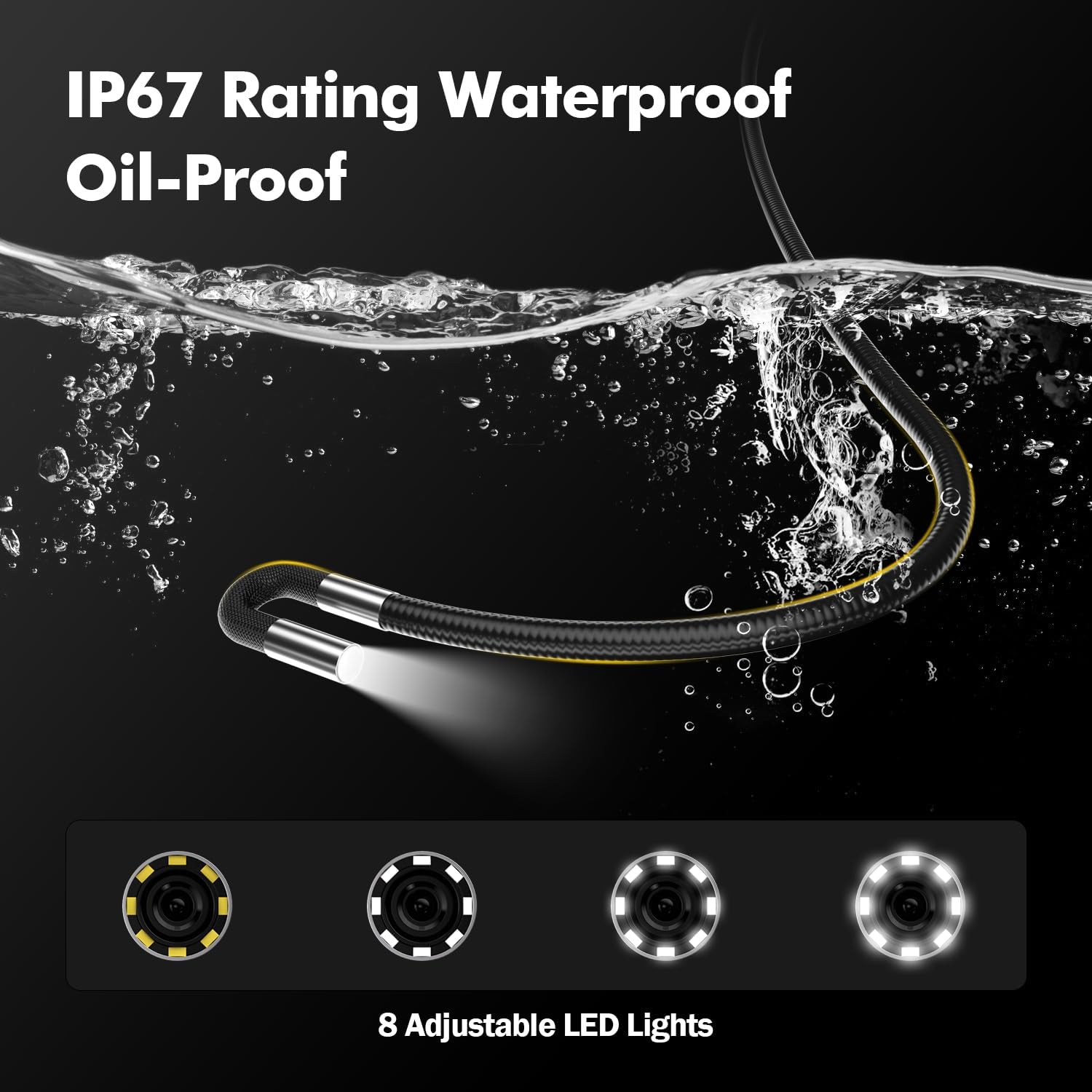 【Waterproof Rigid Gooseneck Probe】Enabling you to reach tight spaces and navigate around corners effortlessly. The waterproof probe with 8 adjustable leds allows you to explore underwater or in other wet /dark conditions. This articulating scope is the ideal inspection tool for automotive, aircraft, mechanics, etc.