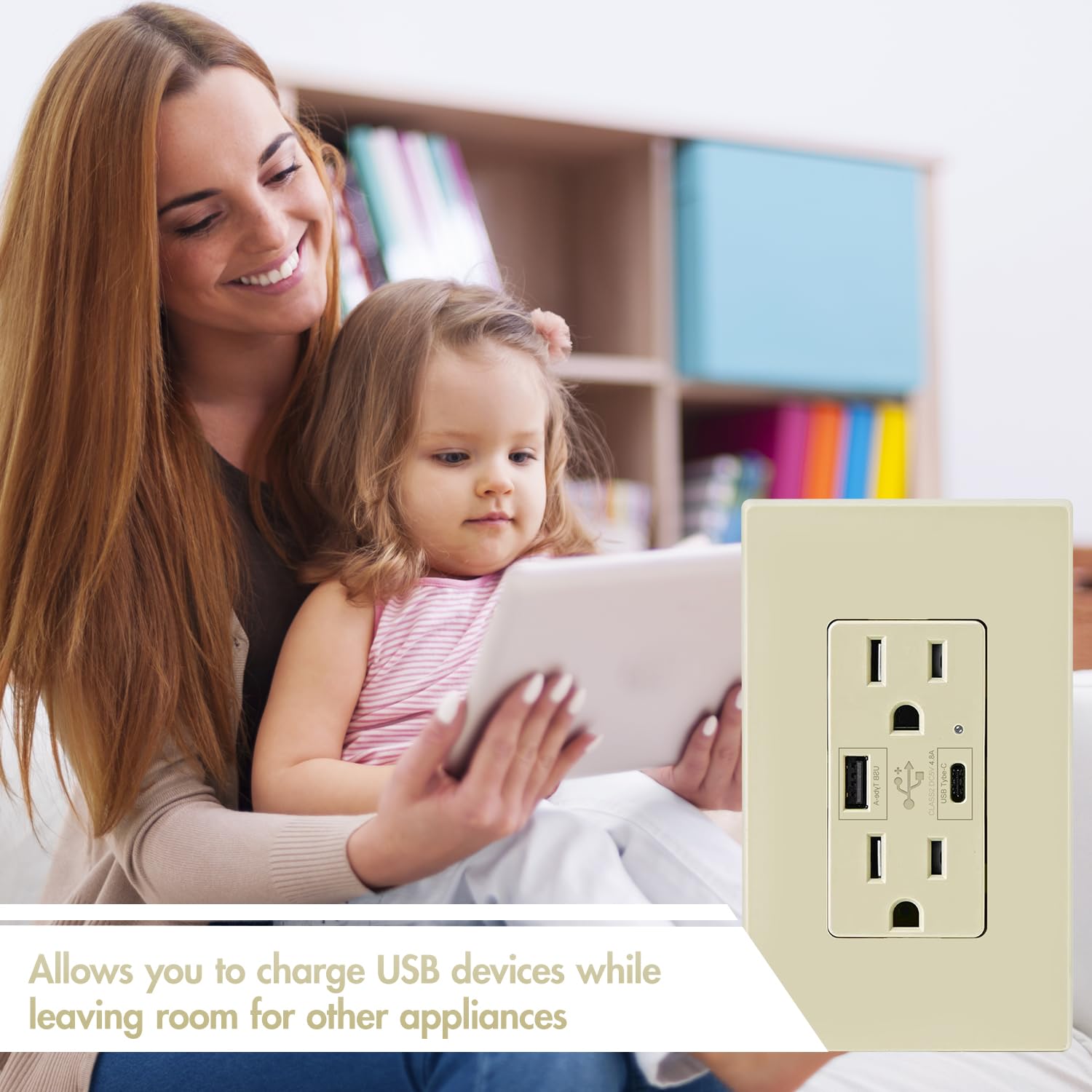 USB C Charger Wall Outlet 4.8A Double Height Wall Panel Receptacle, 15A Tamper-Proof Receptacle, Smart Fast Charging, with UL Certification, not for Laptop (Ivory 15A 2 Pack)