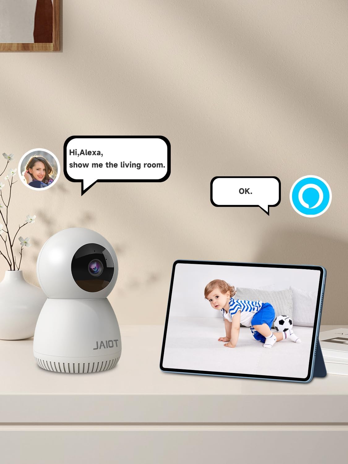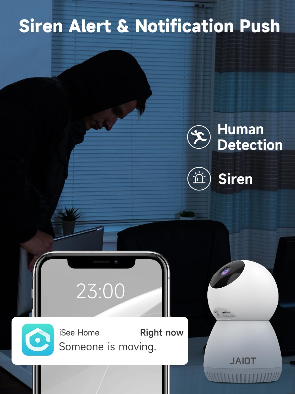 【Night Vision & Two-Way Audio】 JAIOT cameras for home security is featured with infrared night vision function, which ensures clear, vivid pictures and stunning surveillance at night. Advanced IR night vision up to 33ft. Built-in microphone & speaker offers to Two-Way audio and support communicate with your family and pet when you are out.