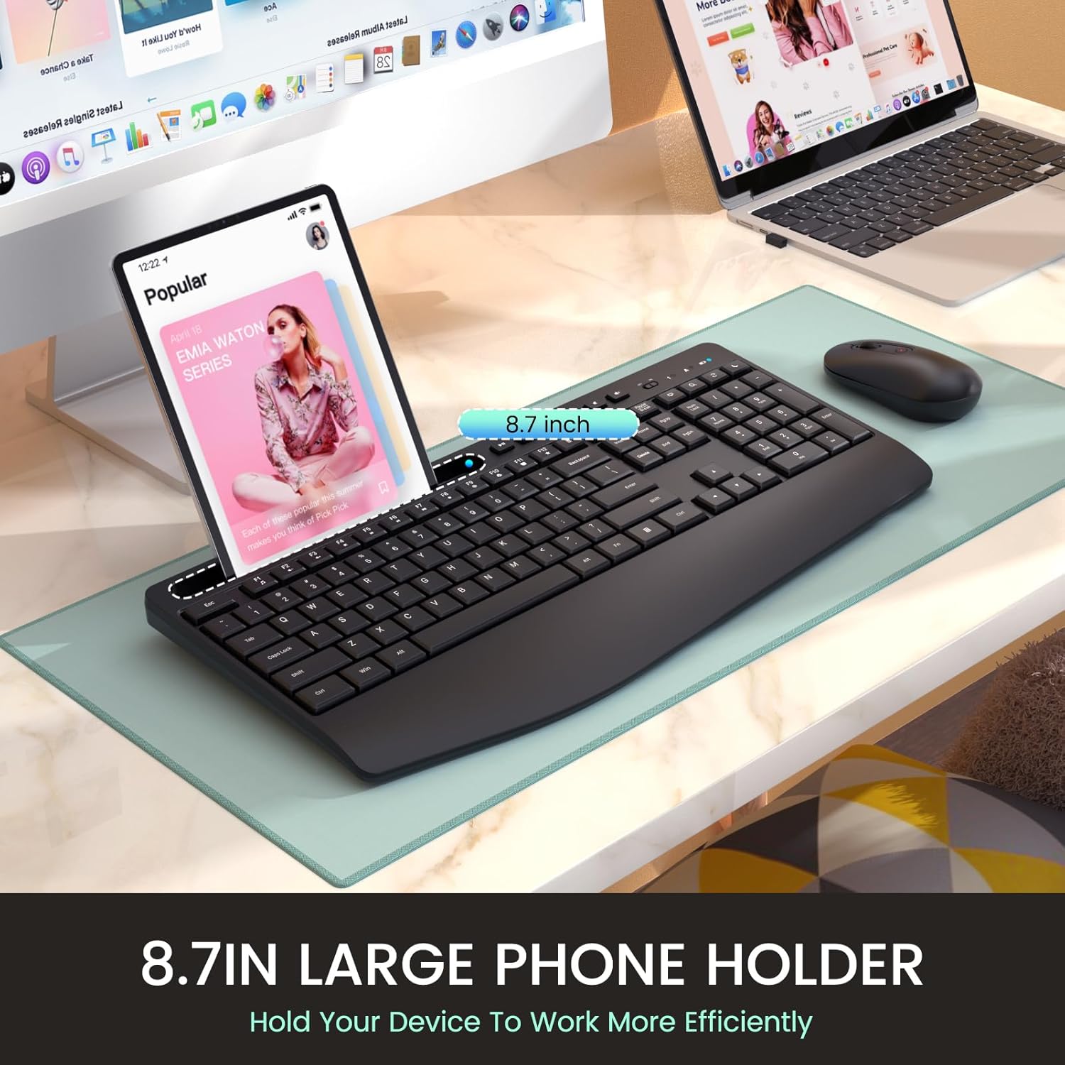 Wireless Keyboard and Mouse Combo,LIZRROT Ergonomic Computer Keyboard with Wrist Rest,2.4GHz Full-Sized Silent Mouse and Keyboard Combo with Phone Holder for Window, Mac, PC, Laptop