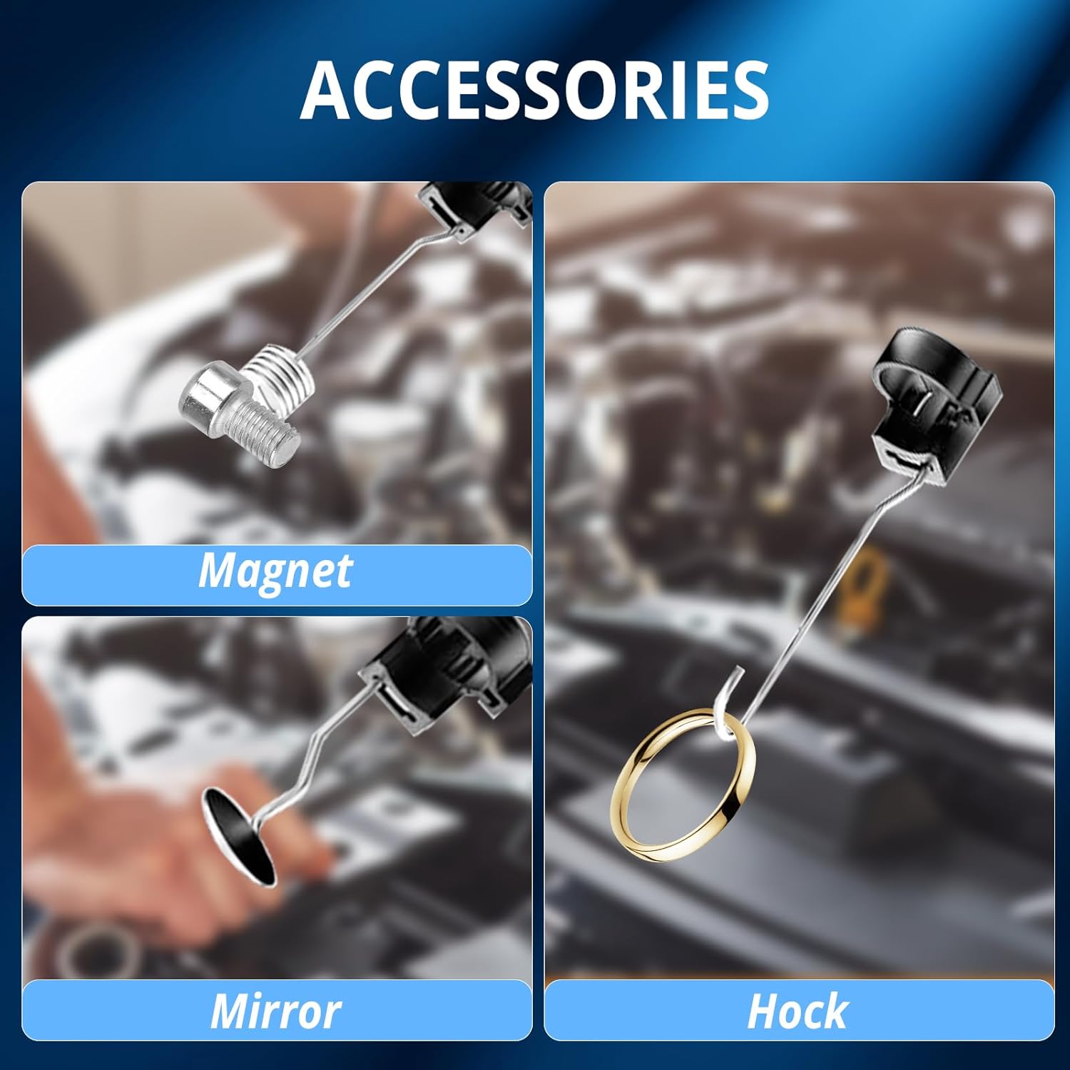 【Flexible and Durable 】Snake camera is equipped with 16.5 FT (5M) semi-rigid cable, which can be bent at will and remain semi-rigid, and can easily reach all kinds of narrow and corners. It also comes with three accessories: hook, magnet and small mirror light, which can meet different requirements