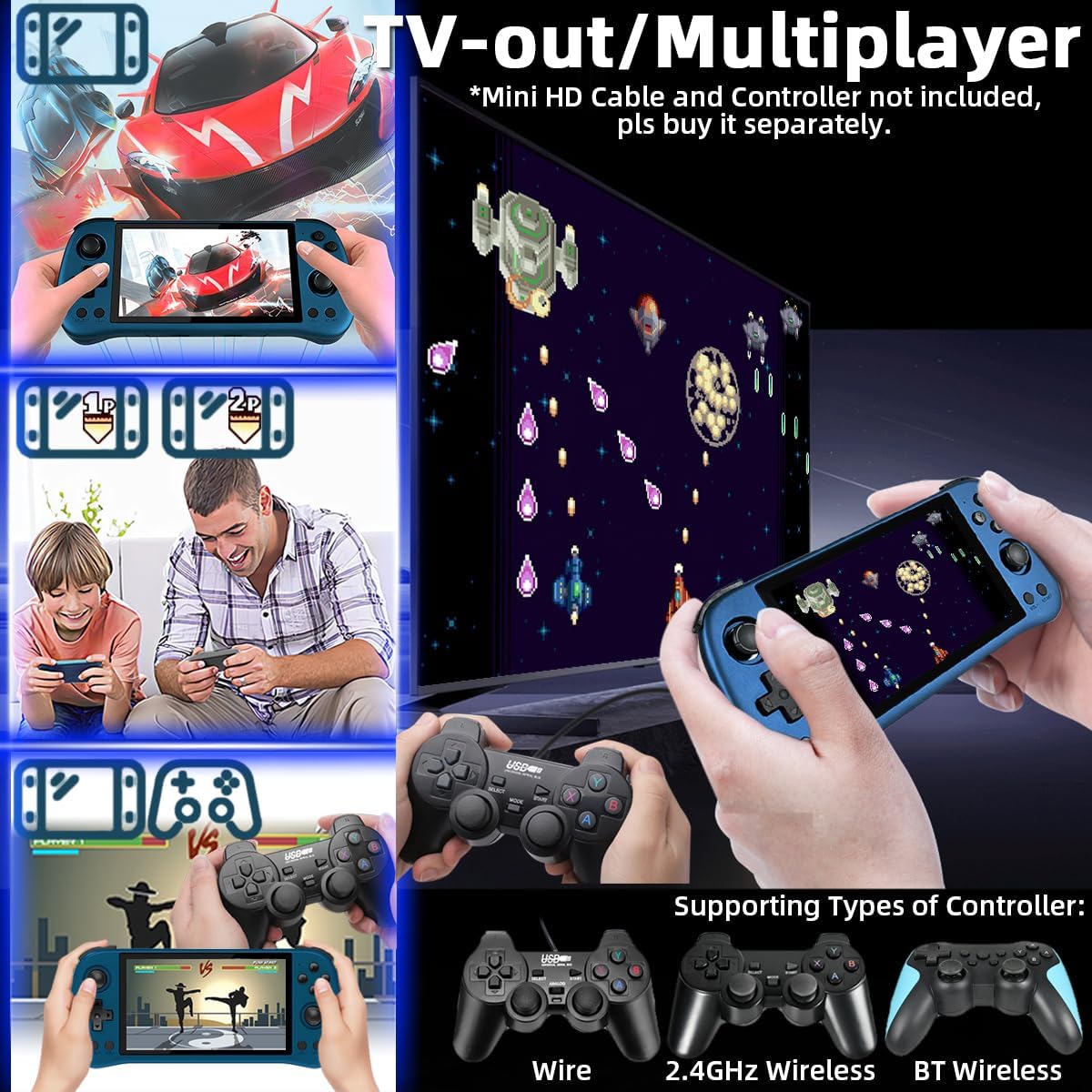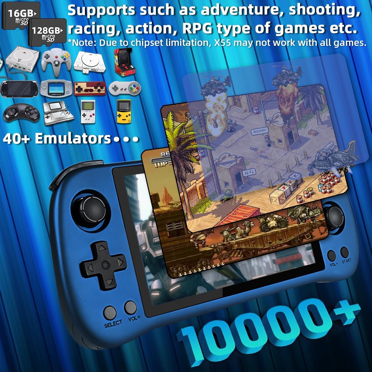 10000+ Slected Classic Games: This X55 game console supports dozens of emulators which covers many types of games, such as adventure, action, racing, etc. And work with 40 platforms where to find nostalgia and memory.