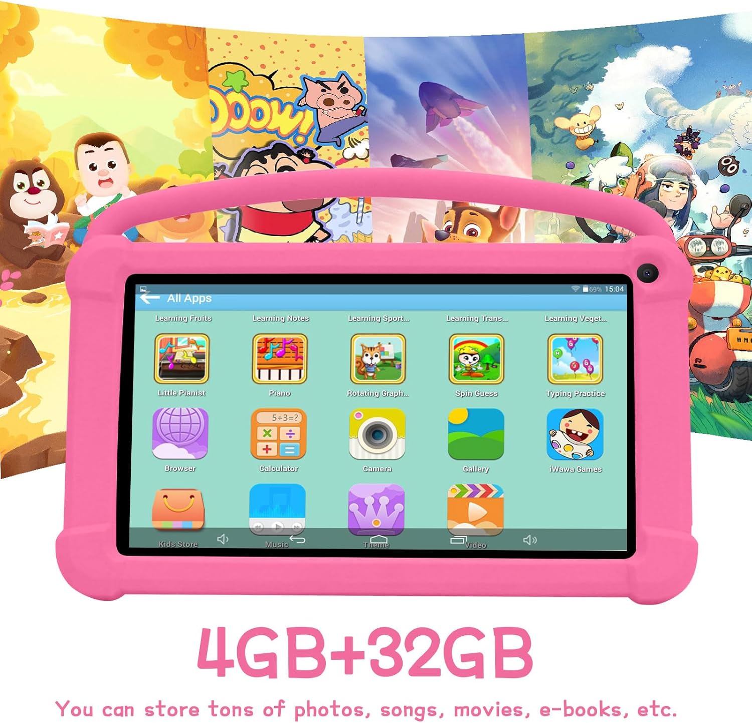 【4GB +32GB Performance Kids Tablet】Tablet adopt 4GB (2GB+2GB) RAM, 32GB ROM, Android 12 system. Large capacity RAM and new System, ensures the fast speed when open apps and multi task. 1024×600 IPS display, Wifi, Bluetooth, front 2.0+ back 5.0MP HD Camera. Dual Speaker, 3.5mm headphone jack. Pre installed kids apps, Specially designed for different age kids. Different color for choice.